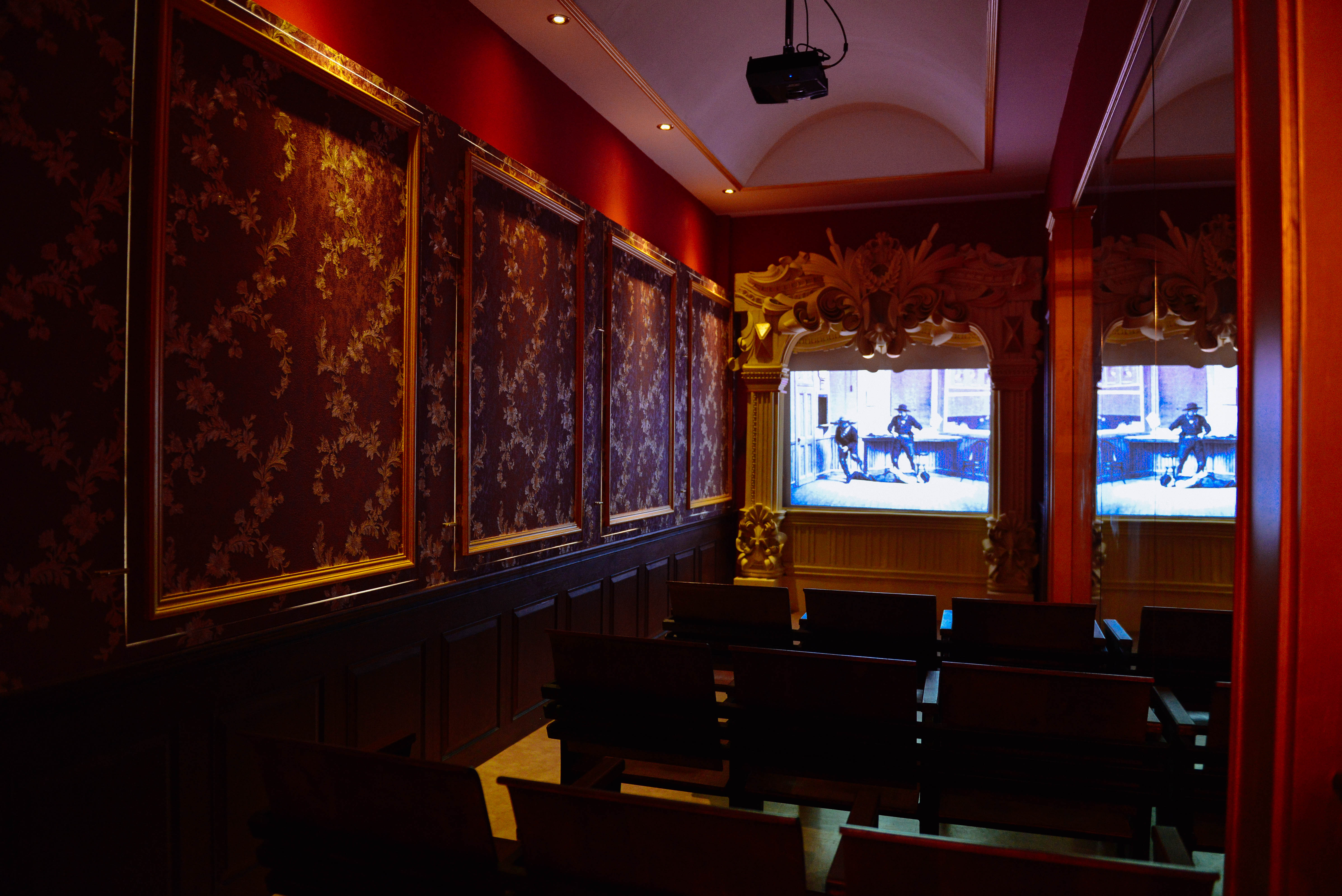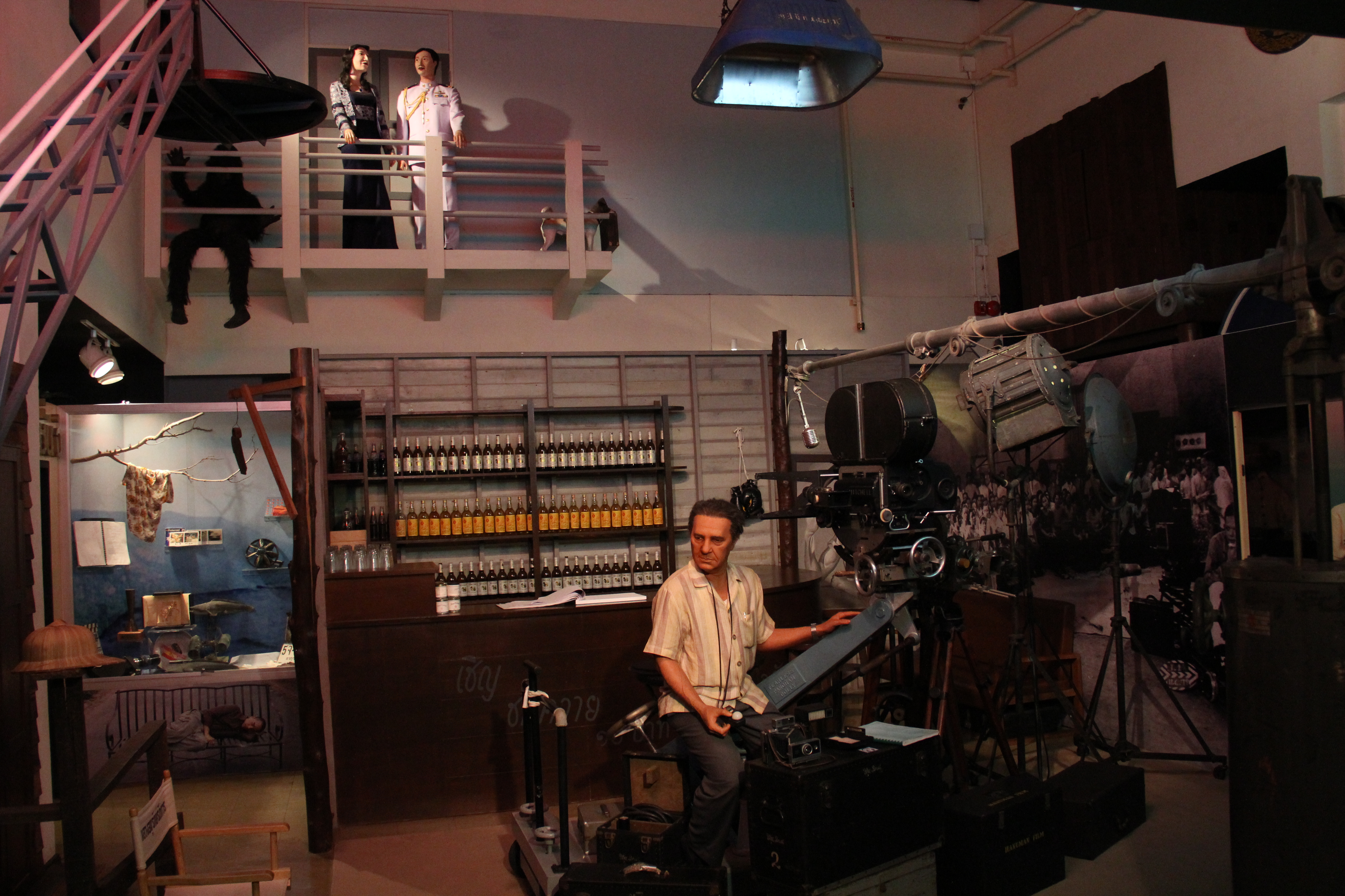 จำลองบรรยากาศการฉายหนังขึ้นจอครั้งแรกในโลกเมื่อ 28 ธันวาคม พ.ศ. 2438 ที่ใต้ถุนร้านกาแฟในกรุงปารีสซึ่งถือเป็นวันกำเนิดภาพยนตร์ขึ้นบนโลกอย่างเป็นทางการ