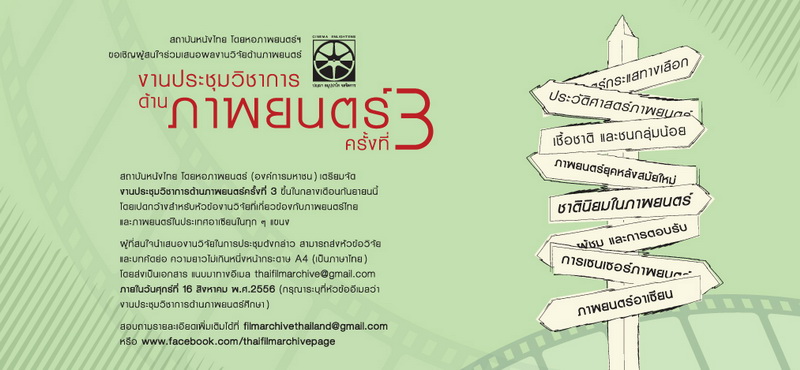 ภายในวันศุกร์ที่ ๑๖ สิงหาคม ๒๕๕๖ (กรุณาระบุหัวข้อว่า งานประชุมวิชาการด้านภาพยนตร์ศึกษา) สอบถามรายละเอียดเพิ่มเติมได้ที่