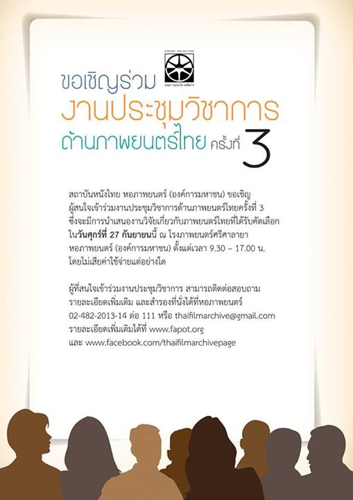 ซึ่งจะมีการนำเสนองานวิจัยเกี่ยวกับภาพยนตร์ไทยที่ได้รับคัดเลือก ในวันศุกร์ที่ ๒๗ กันยายนนี้ ณ โรงภาพยนตร์ศรีศาลายา