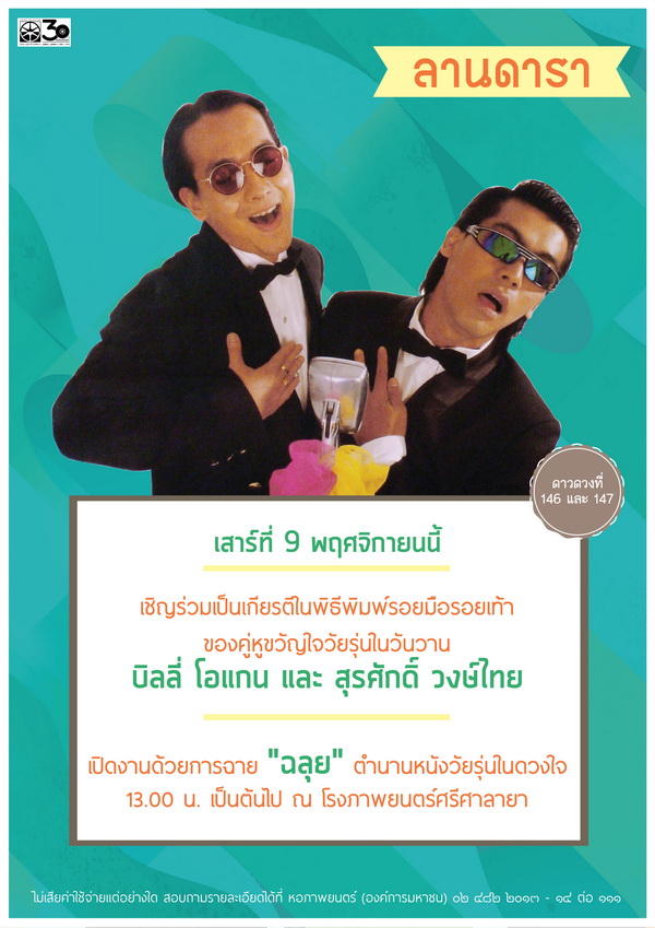 | ๑๕.๔๕ น. | รับฟังประสบการณ์การทำงานในวงการภาพยนตร์ของคู่หูขวัญใจวัยรุ่นในวันวาน |