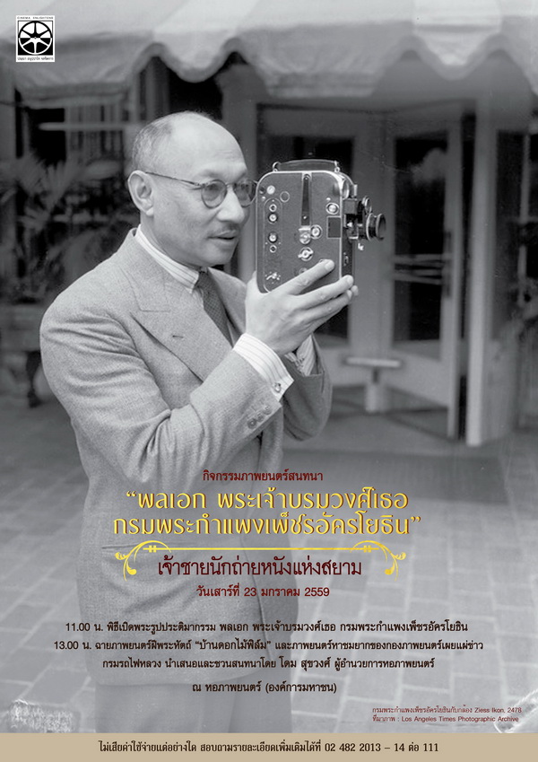 วันเสาร์ที่ ๒๓ มกราคม ๒๕๕๙ เนื่องในวันคล้ายวันประสูติของ พลเอก พระเจ้าบรมวงศ์เธอ กรมพระกำแพงเพ็ชรอัครโยธิน นักถ่ายภาพยนตร์สมัครเล่นคนสำคัญของสยาม และทรงเป็นผู้มีบทบาทโดดเด่นที่สุดคนหนึ่งในหน้าประวัติศาสตร์ภาพยนตร์ไทย หอภาพยนตร์ (องค์การมหาชน) ขอเชิญทุกท่านมาร่วมเปิดพระรูปประติมากรรม และร่วมชมผลงานภาพยนตร์ฝีพระหัตถ์ และพูดคุยแลกเปลี่ยนความรู้ ในกิจกรรมภาพยนตร์สนทนา “พลเอก พระเจ้าบรมวงศ์เธอ กรมพระกำแพงเพ็ชรอัครโยธิน เจ้าชายนักถ่ายหนังแห่งสยาม” ตั้งแต่เวลา ๑๑.๐๐ น. เป็นต้นไป ณ หอภาพยนตร์ (องค์การมหาชน) ไม่เสียค่าใช้จ่ายในการเข้าชมแต่อย่างใด สอบถามข้อมูลเพิ่มเติมได้ที่ ๐๒-๔๘๒-๒๐๑๓-๑๔ ต่อ ๑๑๑