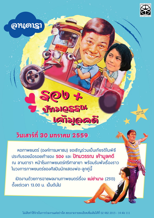 วันเสาร์ที่ ๓๐ มกราคม ๒๕๕๙ หอภาพยนตร์ (องค์การมหาชน) ขอเชิญแฟนภาพยนตร์ทุกท่านมาร่วมเป็นเกียรติ ในพิธีประทับรอยมือรอยเท้าดาวดวงที่