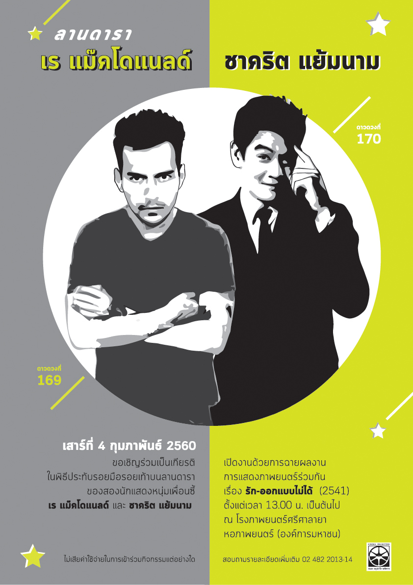 วันเสาร์ 4 กุมภาพันธ์ 2560 เร แม๊คโดแนลด์ และ ชาคริต แย้มนาม สองเพื่อนซี้นักแสดงผู้มากฝีมือด้านการแสดงจะเดินทางมาประทับรอยมือรอยเท้าเป็นดาวดวงที่ 169 และ 170 ณ ลานดารา หน้าโรงภาพยนตร์ศรีศาลายา หอภาพยนตร์ (องค์การมหาชน) พร้อมบอกเล่าประสบการณ์การทำงานในวงการภาพยนตร์ให้ได้รับฟังอย่างใกล้ชิด เปิดงานด้วยผลงานการแสดงภาพยนตร์ร่วมกันเรื่อง O-negative รัก-ออกแบบไม่ได้ (2541) ตั้งแต่เวลา 13.00 น. เป็นต้นไป ไม่เสียค่าใช้จ่ายในการร่วมงานแต่อย่างใด สอบถามรายละเอียดได้ที่ 02 482 2013-14