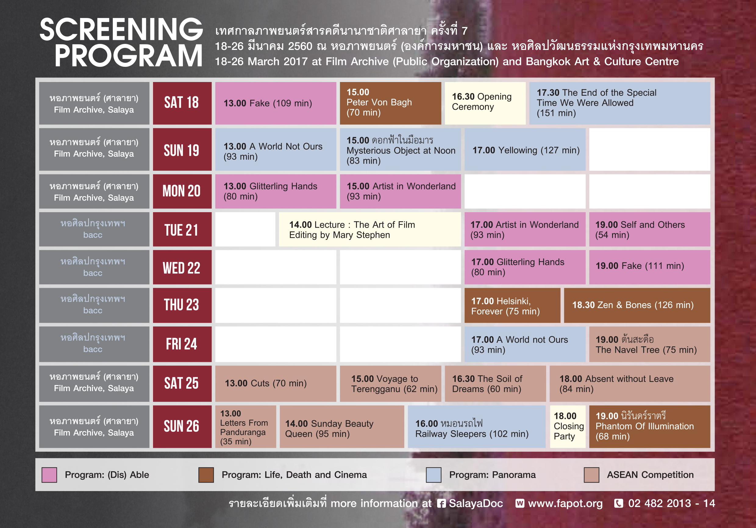 วันที่ 18-26 มีนาคม 2560 ณ หอภาพยนตร์ (องค์การมหาชน) และหอศิลปวัฒนธรรมแห่งกรุงเทพมหานคร