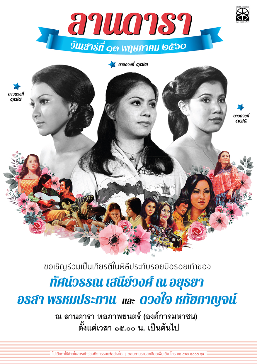 โดยทั้งสามจะมาร่วมเป็นเกียรติประทับรอยมือรอยเท้า เพื่อเป็นอมตนุสรณ์ ณ ลานดารา ในวันเสาร์ที่ 13 พฤษภาคม 2560 หอภาพยนตร์ ขอเชิญแฟนหนังไทยทุกท่านร่วมเป็นสักขีพยาน พร้อม พร้อมร่วมรับฟังประสบการณ์การทำงานในวงการภาพยนตร์ของทั้งสามท่านอย่างใกล้ชิด เปิดงานด้วยการฉายภาพยนตร์เรื่อง ป่ากามเทพ (2519) ตั้งแต่เวลา 13.00 น. เป็นต้นไป ณ โรงภาพยนตร์ศรีศาลายา หอภาพยนตร์ (องค์การมหาชน)