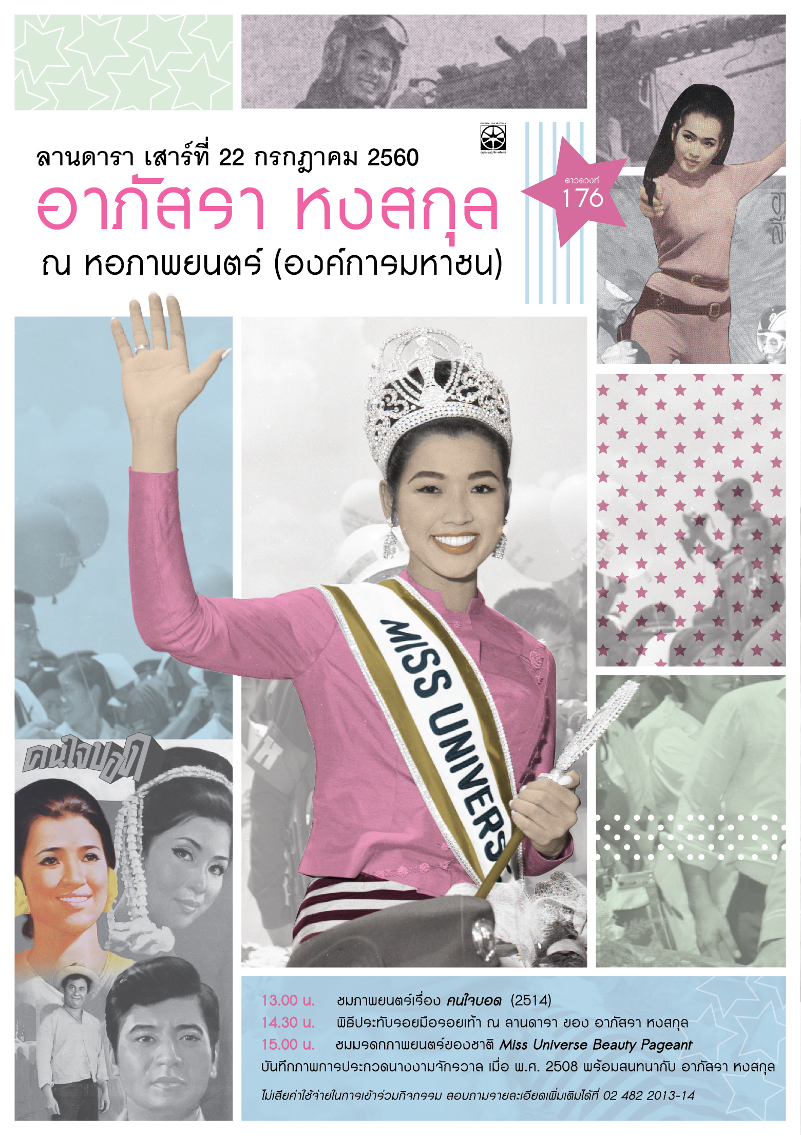 วันเสาร์ที่ 22 กรกฎาคม 2560 ขอเชิญแฟนหนังไทยทุกท่านมาร่วมเป็นสักขีพยานในการประทับรอยมือรอยเท้าเป็นอมตนุสรณ์ของ อาภัสรา หงสกุล ณ ลานดารา หอภาพยนตร์ (องค์การมหาชน) พร้อมร่วมชมผลงานการแสดงภาพยนตร์เรื่อง คนใจบอด และภาพยนตร์แห่งความทรงจำของชาติ Miss Universe Beauty Pageant (การประกวดนางสาวจักรวาล) บันทึกเหตุการณ์การประกวดนางงามจักรวาลของ อาภัสรา หงสกุล เมื่อวันที่ 24กรกฎาคม 2508 ณ เมืองไมอามี่ มลรัฐฟลอริดา สหรัฐอเมริกา ซึ่งได้รับการขึ้นทะเบียนให้เป็นมรดกภาพยนตร์ของชาติ ประจำปี 2559 (บรรยายภาษาไทย) อีกทั้งยังมีการพูดคุยแลกเปลี่ยนความทรงจำในเหตุการณ์ดังกล่าวและประสบการณ์ในการแสดงภาพยนตร์กับอาภัสรา หงสกุล