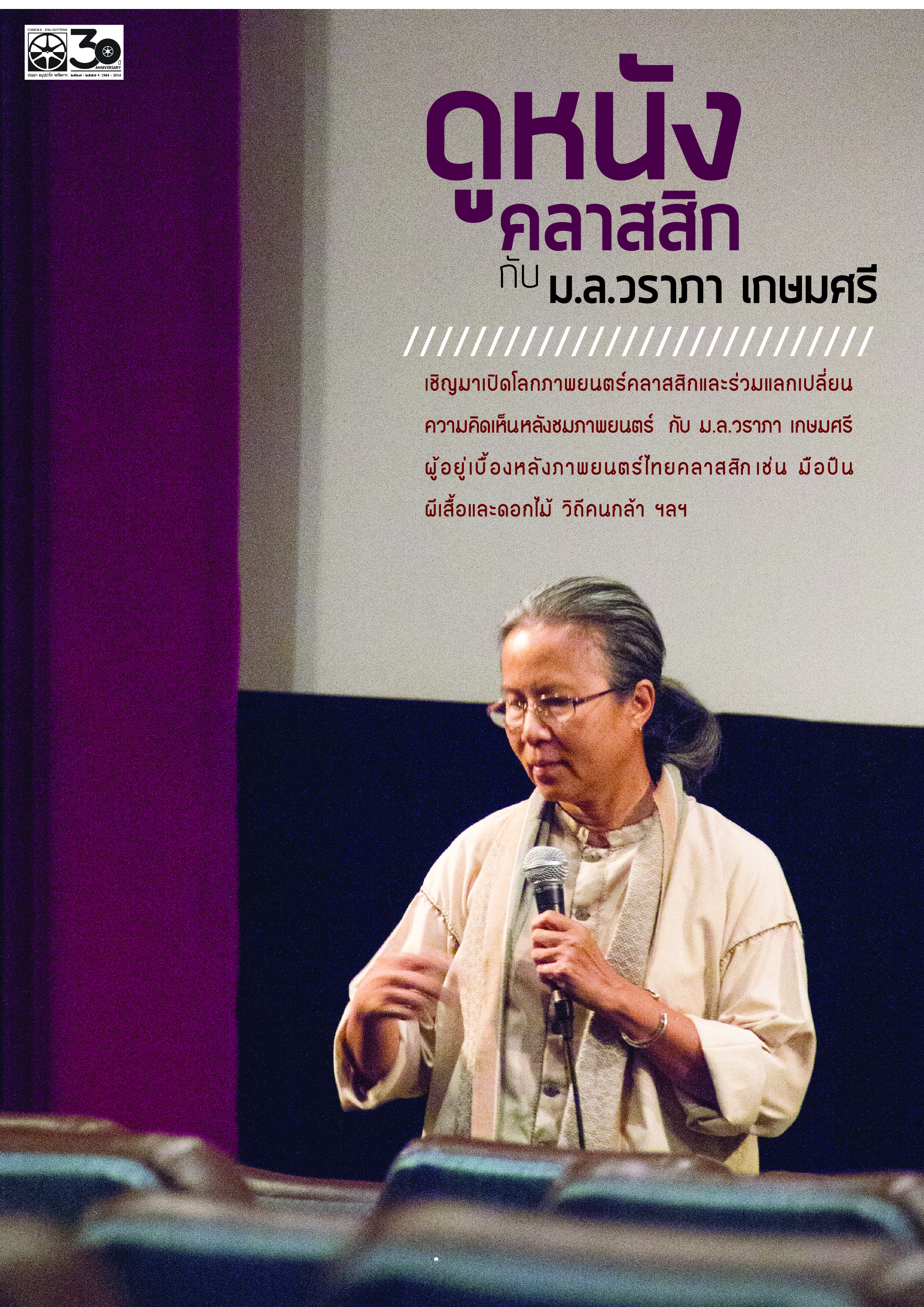 ร่วมชมหนังคลาสสิกกับ ม.ล.วราภา เกษมศรี ผู้อยู่เบื้องหลังหนังไทยเรื่องสำคัญหลายเรื่อง และเป็นครูสอนภาพยนตร์แก่นักเรียนโรงเรียนทางเลือกหรือค่ายอบรมต่าง ๆ มากมาย ที่จะมาชวนผู้ชมร่วมแลกเปลี่ยนมุมมองต่อโลกและชีวิตหลังชมภาพยนตร์