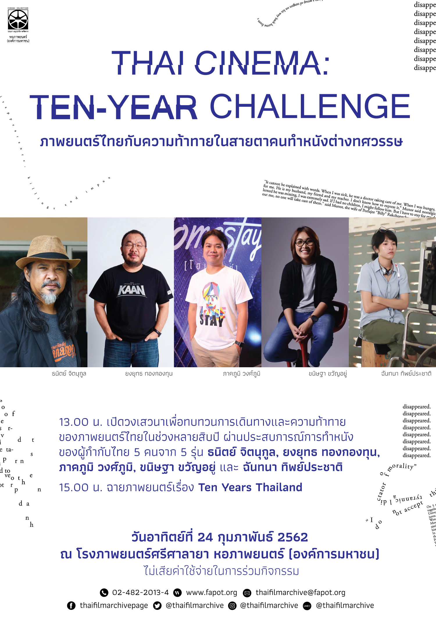 หอภาพยนตร์ (องค์การมหาชน) จัดวงเสวนา “Thai Cinema: Ten-Year Challenge ภาพยนตร์ไทยกับความท้าทายในสายตาคนทำหนังต่างทศวรรษ” พร้อมฉายภาพยนตร์เรื่อง Ten Years Thailand วันอาทิตย์ที่ 24 กุมภาพันธ์นี้ ที่โรงภาพยนตร์ศรีศาลายา หอภาพยนตร์ เพื่อทบทวนการเดินทางของภาพยนตร์ไทยในช่วงหลายสิบปีที่ผ่านมา เปลี่ยนผ่านสู่ปัจจุบันและอนาคตที่อยู่ตรงหน้า ผ่านประสบการณ์การทำหนังของผู้กำกับไทย 5 คนจาก 5 รุ่น ธนิตย์ จิตนุกูล, ยงยุทธ ทองกองทุน, ภาคภูมิ วงศ์ภูมิ, ขนิษฐา ขวัญอยู่ และฉันทนา ทิพย์ประชาติ ซึ่งแต่ละคนเริ่มเข้าสู่วงการภาพยนตร์ไทยในช่วงเวลาที่ห่างกันประมาณ 10 ปี ตั้งแต่ช่วงทศวรรษที่ 2520 ถึงปัจจุบัน ทั้ง 5 คนสามารถเป็นตัวแทนของภาพวงการหนังไทยทั้งในแง่ความสำเร็จ ความไม่แน่นอน และความท้าทายที่แตกต่างกันไปในทุกยุคสมัย