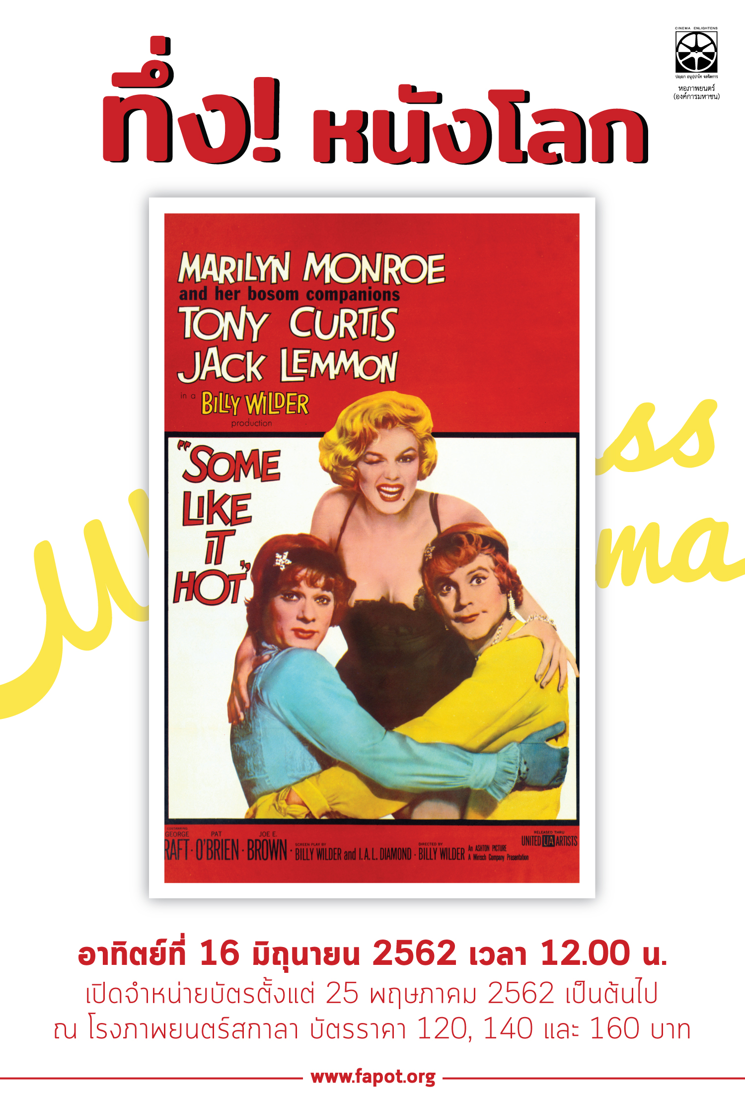 ทึ่ง! หนังโลก เดือนมิถุนายนนี้ เชิญมาร่วมเฉลิมฉลองในวาระครบรอบ 60 ปี Some Like It Hot สุดยอดงานคลาสสิกปี 1959 ของผู้กำกับ บิลลี ไวลเดอร์ ภาพยนตร์ที่ได้รับการโหวตจากสถาบันภาพยนตร์อเมริกันในปี พ.ศ. 2543 ให้เป็นอันดับหนึ่งจาก 100 รายชื่อภาพยนตร์ที่ตลกที่สุดของอเมริกา และถูกเลือกให้เป็นภาพยนตร์ตลกที่ดีที่สุดตลอดกาลจากผลสำรวจความคิดเห็นของนักวิจารณ์ภาพยนตร์ 253 คนที่สำนักข่าวบีบีซีจัดทำขึ้นในปี พ.ศ. 2560 ที่จะมาพร้อมบทบาทการแสดงอันน่าจดจำของดาวค้างฟ้า มาลิรีน มอนโร ที่โรงภาพยนตร์สกาลา